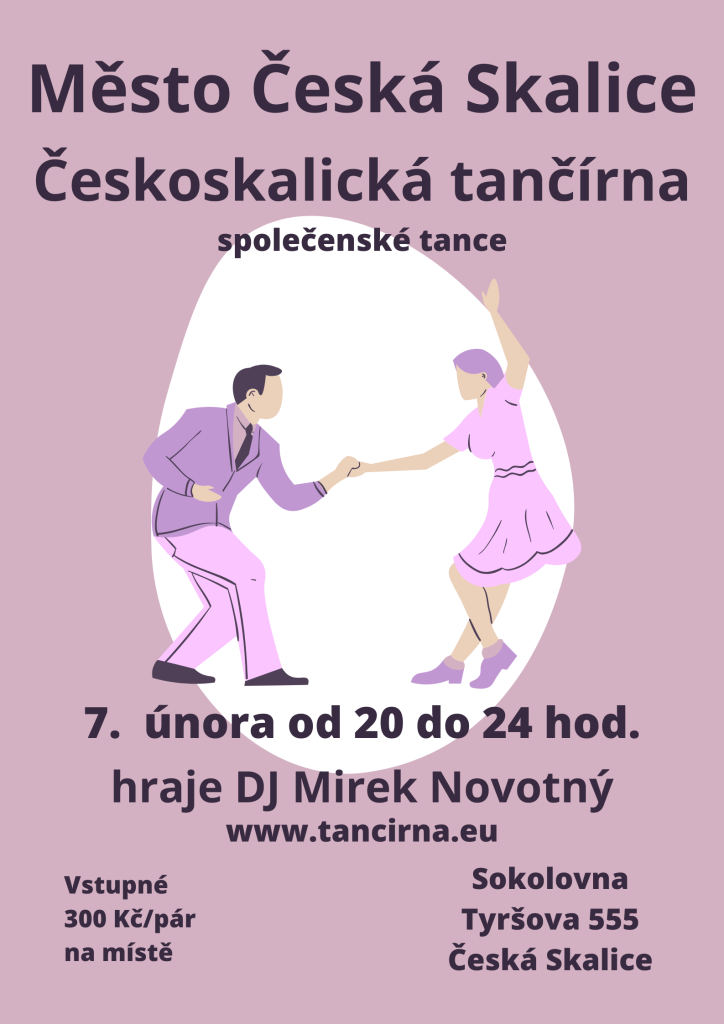 Tančírna 10. 1. 2025 Společenské tance. Hraje DJ Mirek Novotný. Vstupné se platí pouze na místě 300 Kč/pár.