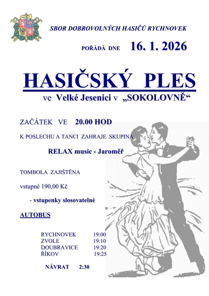 Sbor dobrovolných hasičů Rychnovek vás srdečně zve na tradiční hasičský ples, který se koná 16. ledna 2026 v sokolovně ve Velké Jesenici. Akce začíná v 20:00 a k poslechu a tanci zahraje skupina Relax music z Jaroměře. Těšit se můžete na tombolu, jejíž vstupenky jsou slosovatelné. Pro zájemce je zajištěna autobusová doprava z Rychnovka, Zvole, Doubravice a Říkova, s odjezdem v předvečer akce.