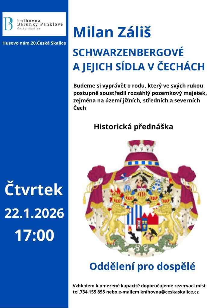 Budeme si vyprávět o rodu, který ve svých rukou postupně soustředil rozsáhlý majetek. Představíme si knížata ze Schwarzenbergu i jako mimořádně úspěšné hospodáře. Vzhledem k omezené kapacitě prosíme o rezervaci míst na tel. 734 155 855.