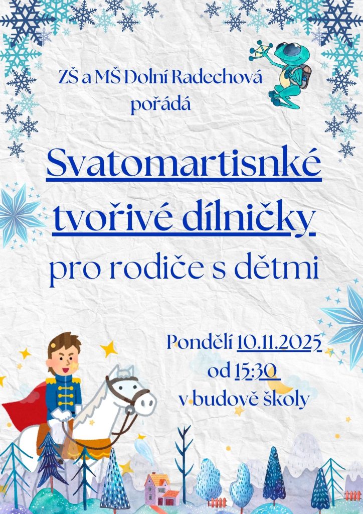 Srdečně zveme všechny naše školáky a školkáčky s jejich rodiči na tvořivé dílničky. Během odpoledne si společně vytvoříte několik výrobků, upečete Svatomartinské rohlíčky a věříme, že si s námi užijete pohodové odpoledne ve škole. Akce začíná v 15:30 a probíhá ve třídách školy i školky. Těšíme se na viděnou.