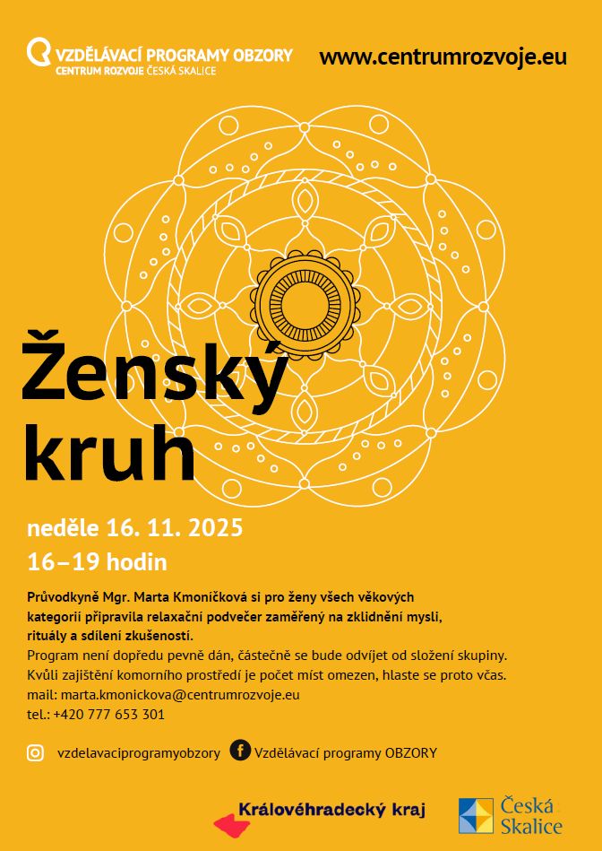 Kvůli zajištění komorního prostředí je počet míst omezen, hlaste se proto včas. Přihlášky na mailu marta.kmonickova@centrumrozvoje.eu, tel. 777 653 301.